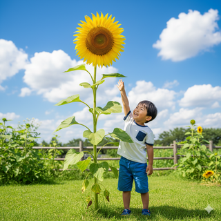 夏休みの初めに蒔いたひまわりの種が、ついに大きな花を咲かせた。小さな種から芽が出て、毎日少しずつ背丈が伸びていく姿を見ていると、「生きている」ということを強く感じた。茎がぐんぐん伸び、葉っぱが太陽に向かって広がる様子はとても力強い。水やりを欠かさず続けるうちに、つぼみがふくらみ、やがて鮮やかな黄色い花びらが開いた。その瞬間、思わず「おめでとう」と声をかけてしまった。花が咲いてからは、ミツバチや蝶が集まるようになり、小さな生態系がそこに広がった。毎日写真を撮ってアルバムにまとめると、成長の過程が一目で分かり、まるで自分が植物の親になったような気持ちになった。ひまわりの堂々とした姿は、夏休みの努力の成果そのものであり、自然の力強さと美しさを改めて感じさせてくれた。この花は、夏が終わってもずっと心の中に咲き続けるだろう。
